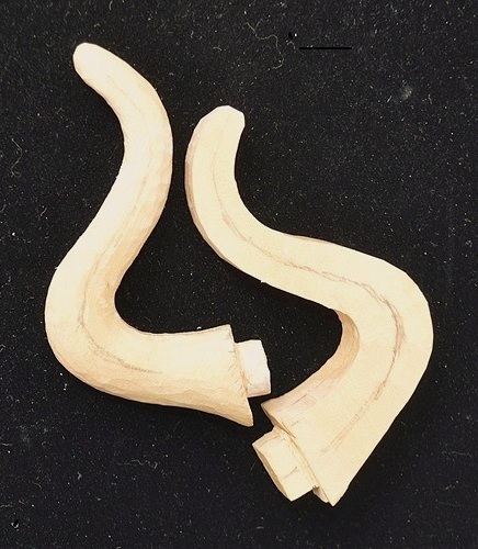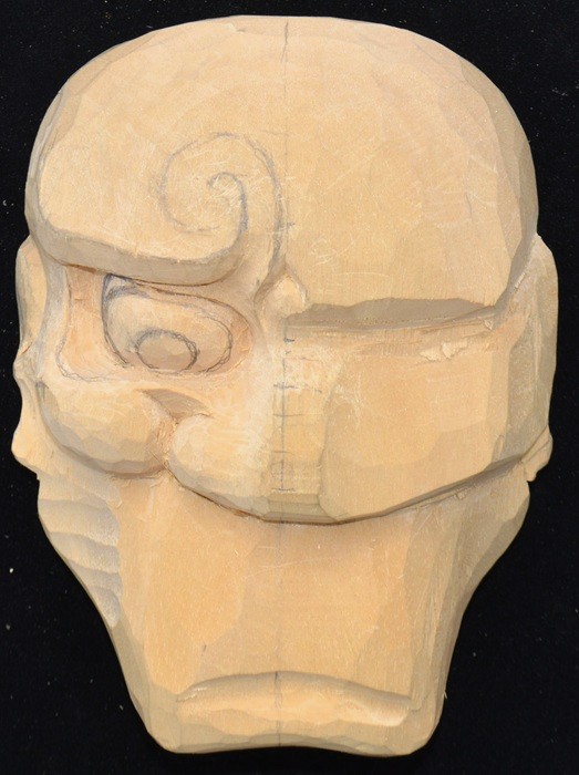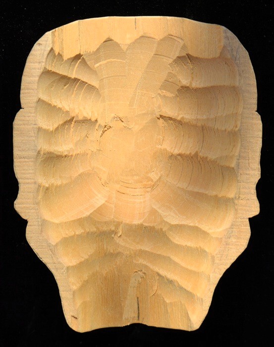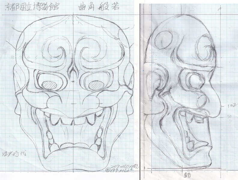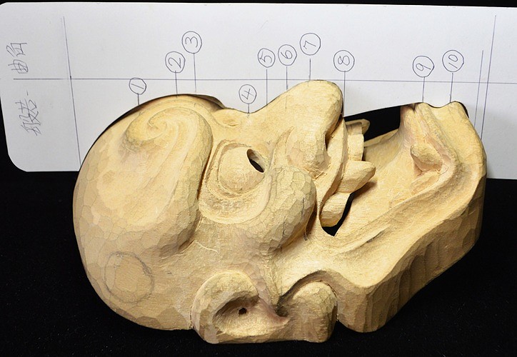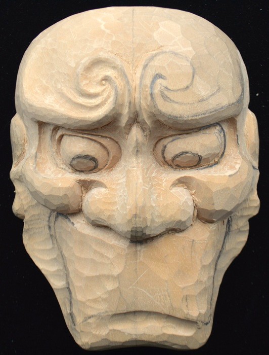 | 縦型は推測で作った型紙から彫りながら修正し3o前後が変更となった箇所がある。 面型、縦中心型、横型-10、目の縦型-2、口開け型と合わせ全部で15種類を作った。 |
