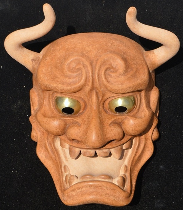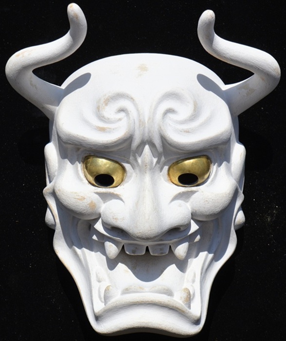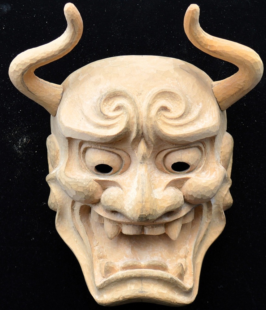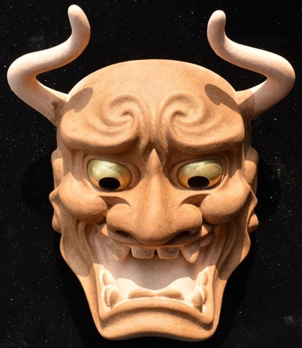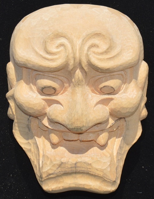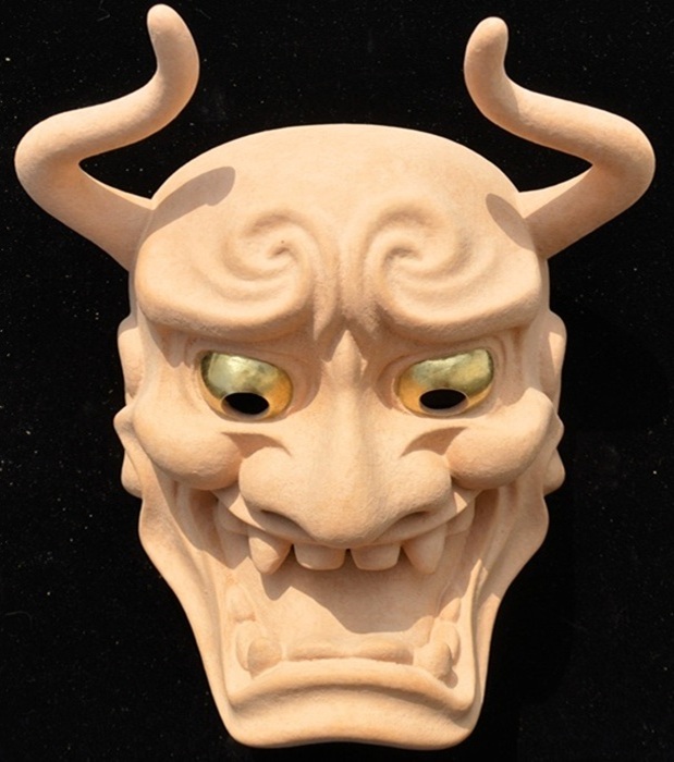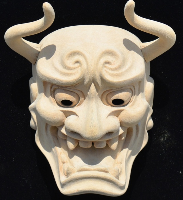 角が大きく湾曲しており、鋭い視線と大きな口が特徴で、怒りと悲しみなどの二面性を表現する鬼女の面。 京都国立博物館蔵(作者不詳 江戸時代)を参考 207x160x103 | |