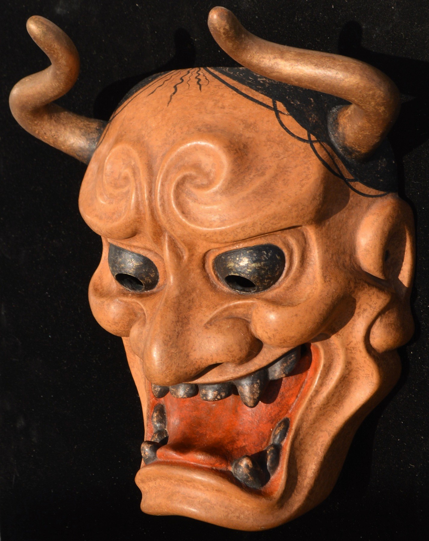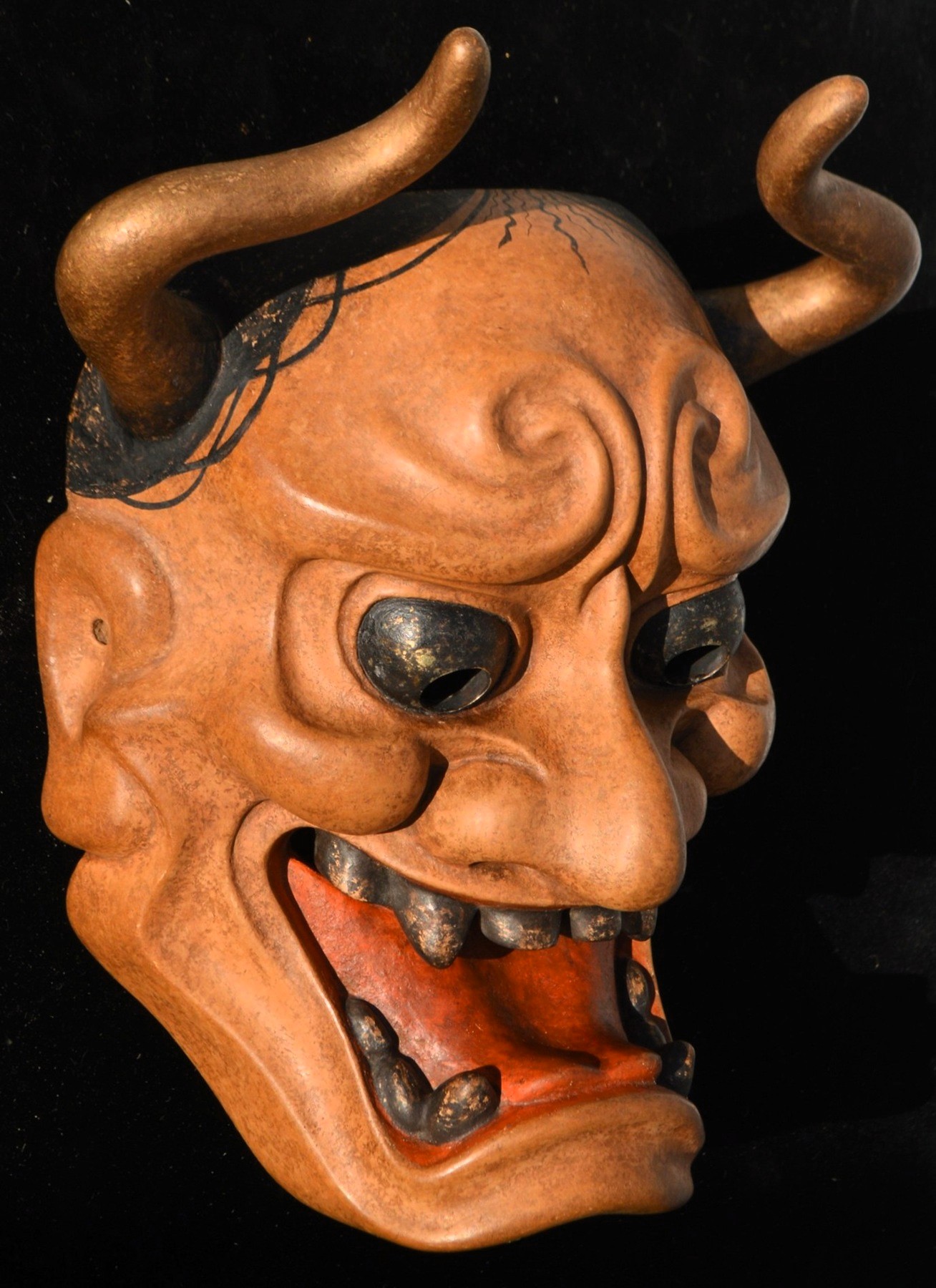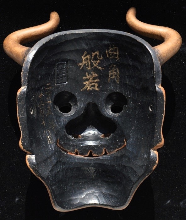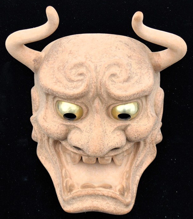 角が大きく湾曲しており、鋭い視線と大きな口が特徴で、怒りと悲しみなどの二面性を表現する鬼女の面。 京都国立博物館蔵(作者不詳 江戸時代)を参考 207x160x103 | |
